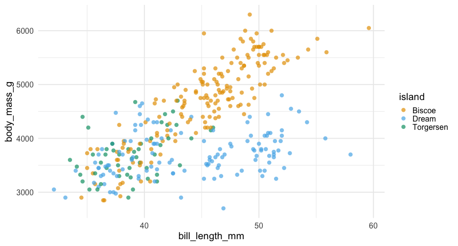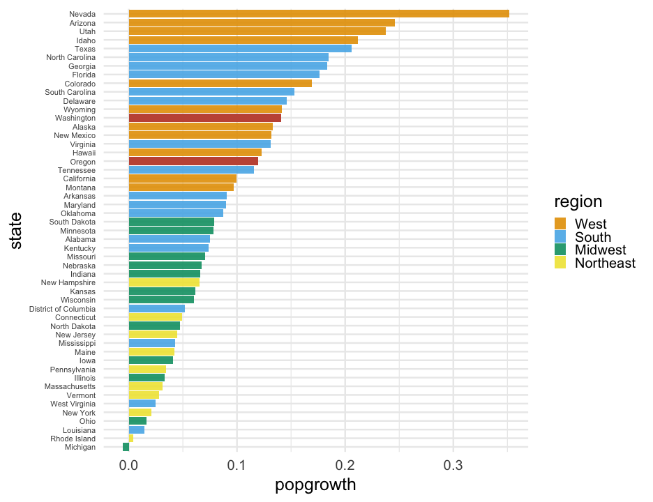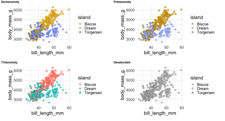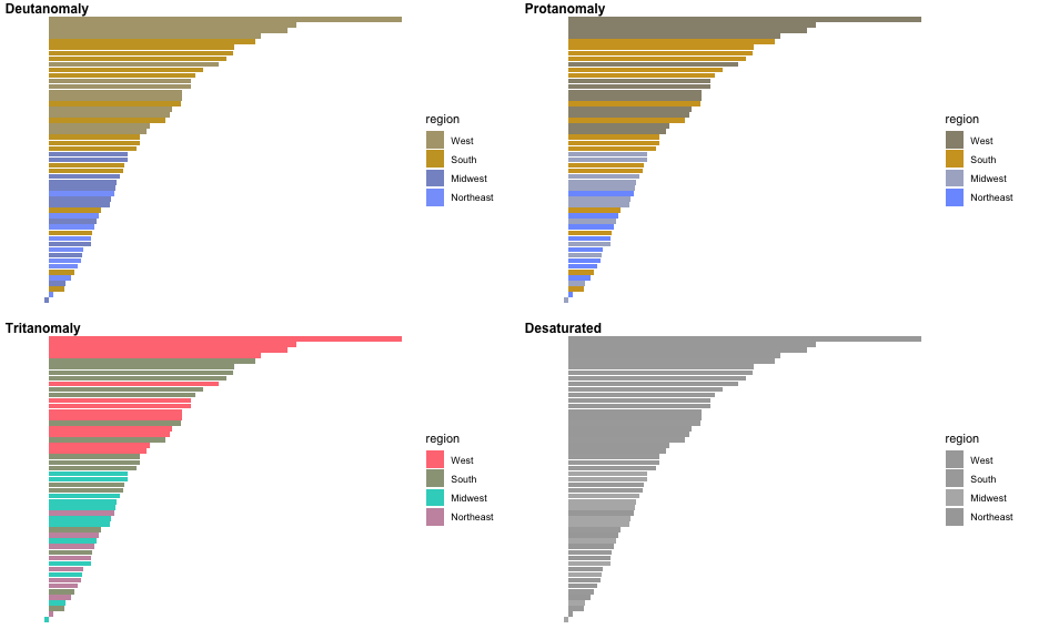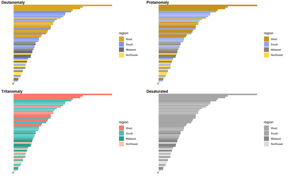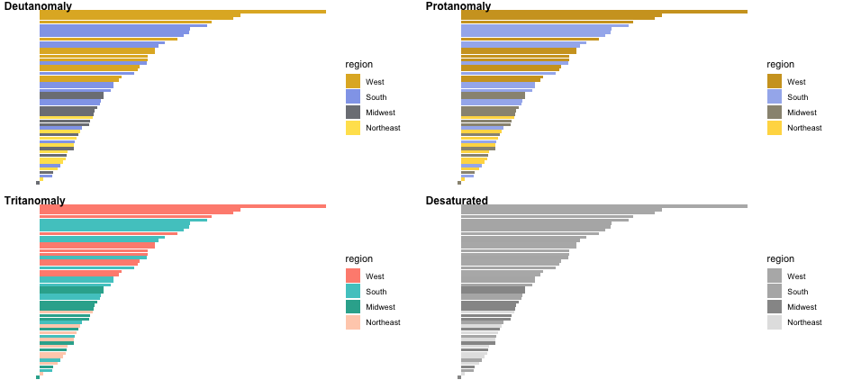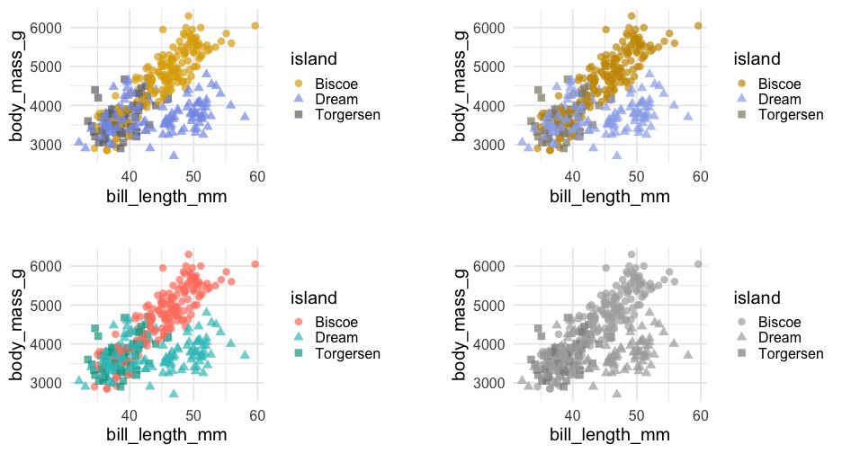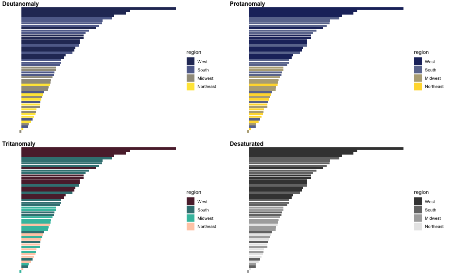 class: center, middle, inverse, title-slide # Colors! ### Daniel Anderson ### Week 5 --- layout: true <script> feather.replace() </script> <div class="slides-footer"> <span> <a class = "footer-icon-link" href = "https://github.com/uo-datasci-specialization/c2-dataviz-2022/raw/main/static/slides/w5.pdf"> <i class = "footer-icon" data-feather="download"></i> </a> <a class = "footer-icon-link" href = "https://dataviz-2022.netlify.app/slides/w5.html"> <i class = "footer-icon" data-feather="link"></i> </a> <a class = "footer-icon-link" href = "https://github.com/uo-datasci-specialization/c2-dataviz-2022"> <i class = "footer-icon" data-feather="github"></i> </a> </span> </div> --- class: inverse-blue # Data viz in Wild Havi Tingyu Dillon ### Eliott, Merly & Esmeralda on deck --- # Agenda * Review Lab 2 * Color basics + 3 basic ways color is used * Color blindness * Some common problems with color use * Quick discussion of palettes * Lab 3 --- class: inverse-red middle # Review Lab 2 --- # Learning Objectives * Understand different types of color palettes + ...and when you should use one versus another * Understand and be able to effectively evaluate concerns related to color blindness * Be able to fluently change colors/fills within ggplot --- # Before we get too deep ### Some very practical advice * Keep straight when color is mapped to a variable through `aes` and when it's modifying an element overall + Former requires `scale_color_*` or `scale_fill_*` while the latter does not -- * Keep straight colors and fills (see former bullet) -- * Use advice of others to your advantage (e.g., http://colorbrewer2.org/) --- class: inverse bottom center background-image:url(http://socviz.co/assets/ch-01-luminance-contrast-color.png) background-size:contain # Why color choice matters --- class: inverse bottom center background-image:url(http://socviz.co/assets/ch-01-luminance-contrast-bw.png) background-size:contain # Why color choice matters --- class: inverse-red middle # Another quick example .realbig[ .middle[ .center[ [{rayshader}](https://resources.rstudio.com/rstudio-conf-2019/3d-mapping-plotting-and-printing-with-rayshader) ] ] ] --- # 3 fundamental uses of color -- 1. Distinguish groups from each other -- 1. Represent data values -- 1. Highlight --- class:inverse-blue middle # Color as a tool to distinguish --- # Discrete items * Often no intrinsic order -- ### Qualitative color scale * Finite number of colors + Chosen to maximize distinctness, while also be equivalent + Equivalent - No color should stand out - No impression of order --- background-image:url(https://serialmentor.com/dataviz/color_basics_files/figure-html/qualitative-scales-1.png) background-size:contain # Some examples .footnote[See more about the Okabe Ito palette origins [here]( http://jfly.iam.u-tokyo.ac.jp/color/)] --- # How do we use them? Imagine we have data like this ```r popgrowth_df ``` ``` ## # A tibble: 51 × 7 ## region division state pop2000 pop2010 popgrowth ## <fct> <chr> <fct> <dbl> <dbl> <dbl> ## 1 Midwest East North Central Michigan 9938444 9883640 -0.005514344 ## 2 Northeast New England Rhode Island 1048319 1052567 0.004052202 ## 3 South West South Central Louisiana 4468976 4533372 0.01440956 ## 4 Midwest East North Central Ohio 11353140 11536504 0.01615095 ## 5 Northeast Middle Atlantic New York 18976457 19378102 0.02116544 ## 6 South South Atlantic West Virginia 1808344 1852994 0.02469110 ## # … with 45 more rows, and 1 more variable: area <dbl> ``` --- # Maybe a plot like this .pull-left[ ```r ggplot(popgrowth_df, aes(x = popgrowth, y = state)) + geom_col(alpha = 0.9) ``` ] .pull-right[ <!-- --> ] --- # Alternatively, fill by region .pull-left[ ```r ggplot(popgrowth_df, aes(x = popgrowth, y = state)) + geom_col(aes(fill = region), alpha = 0.9) ``` ] .pull-right[ <!-- --> ] --- # Problem with default palette <!-- --> --- # Alternative: viridis .pull-left[ ```r ggplot(popgrowth_df, aes(x = popgrowth, y = state)) + geom_col(aes(fill = region), alpha = 0.9) + * scale_fill_viridis_d() ``` ] .pull-right[ <!-- --> ] --- # Revised version <!-- --> --- # The Okabe Ito palette .pull-left[ * From [Color Universal Design](http://jfly.iam.u-tokyo.ac.jp/color/) ```r *library(colorblindr) ggplot(popgrowth_df, aes(x = popgrowth, y = state)) + geom_col(aes(fill = region), alpha = 0.9) + * scale_fill_OkabeIto() ``` ] .pull-right[ <!-- --> ] --- # Okabe Ito for colorblindness <!-- --> --- # How am I checking for colorblindness? * Also part of the **{colorblindr}** package ([here](https://github.com/clauswilke/colorblindr)) + depends on the dev versions of **{colorspace}** and **{cowplot}**, which are useful packages in their own right ```r devtools::install_github("wilkelab/cowplot") install.packages("colorspace", repos = "http://R-Forge.R-project.org") devtools::install_github("clauswilke/colorblindr") ``` --- # A note on installation Occasionally people have run into issues with the install on the previous slide. If that happens, try `install.packages("colorBlindness")` instead, and use the `cvdPlot` function. (It's just a modified version of `cvd_grid` from *colorblindr*) --- ```r p <- ggplot(popgrowth_df, aes(x = popgrowth, y = state)) + geom_col(aes(fill = region), alpha = 0.9) + scale_fill_OkabeIto() + * theme_void() # not necessary but I like it *colorblindr::cvd_grid(p) ``` <!-- --> --- class: inverse-orange middle # Colors for continuous values --- background-image:url(https://serialmentor.com/dataviz/color_basics_files/figure-html/sequential-scales-1.png) background-size:contain # Sequential scale examples --- # Sequential scales * Which values are larger/smaller -- * How distant two values are from each other -- + Scale must be perceptually uniform across its entire range -- + Similar to an interval scale, but for color -- * Often based on a single .bolder[hue] -- * Multi-hue sequential scales tend to follow gradients in the natural world --- class: inverse-red middle # Common uses of sequential palettes --- # H