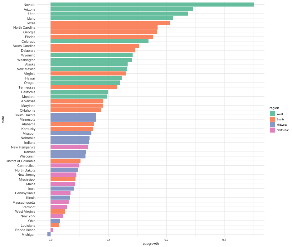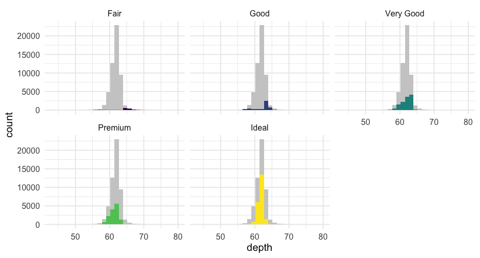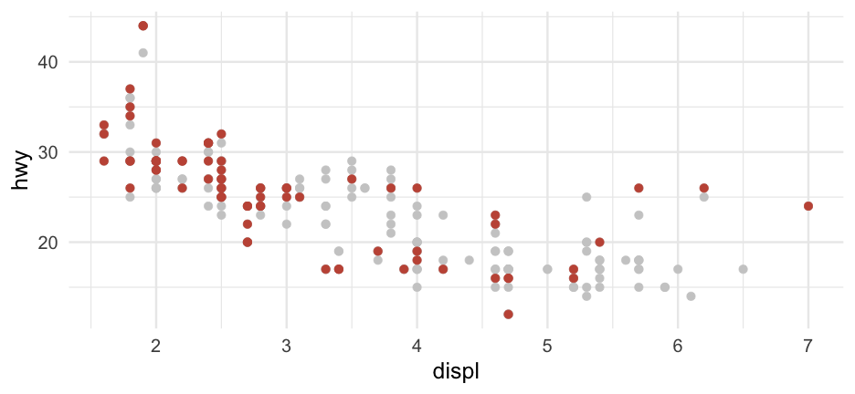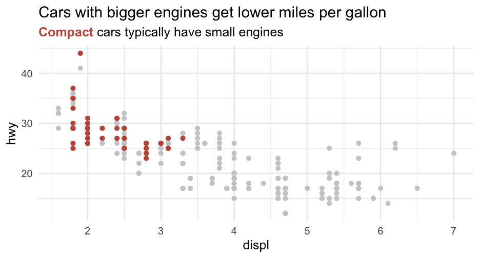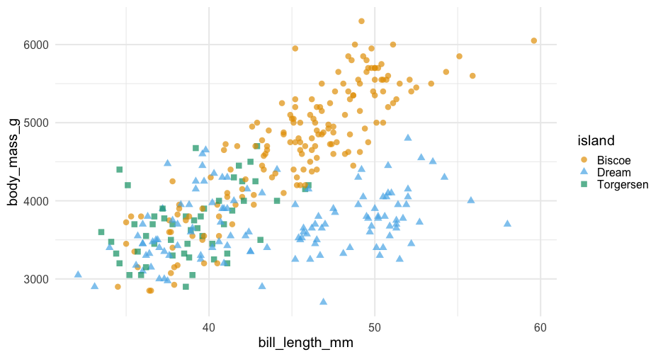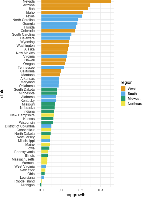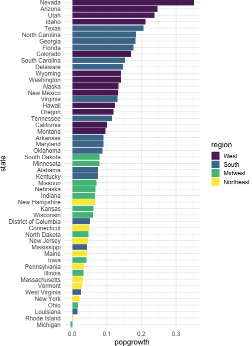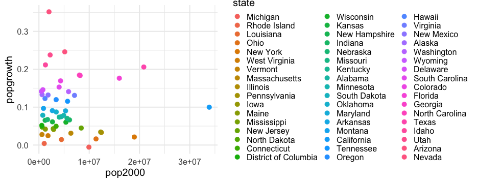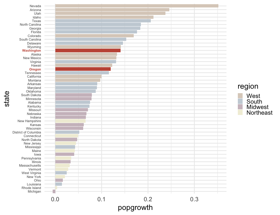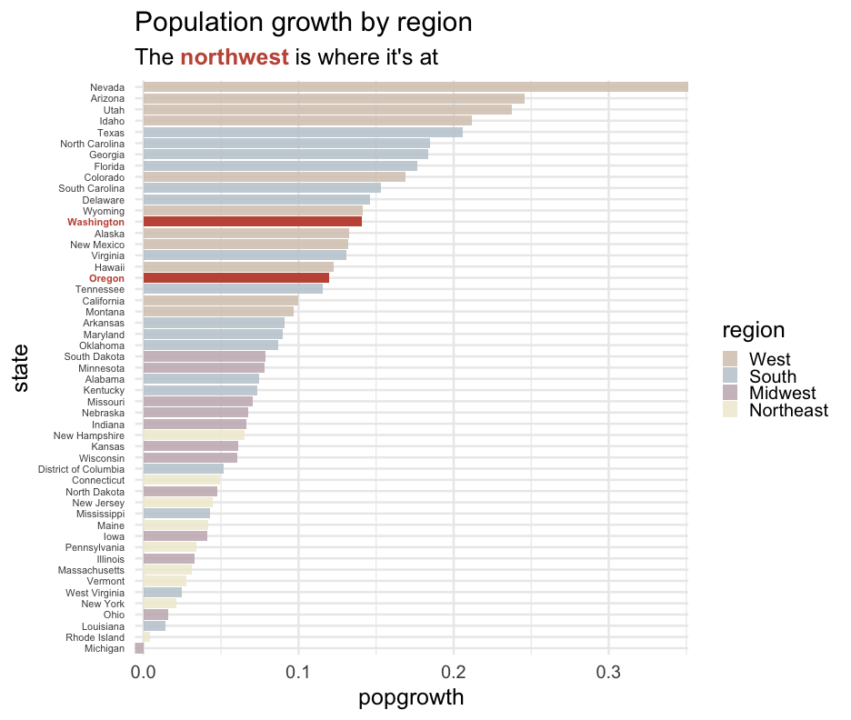 class: center, middle, inverse, title-slide # Colors! ### Daniel Anderson ### Week 5 --- layout: true <script> feather.replace() </script> <div class="slides-footer"> <span> <a class = "footer-icon-link" href = "https://github.com/uo-datasci-specialization/c2-dataviz-2022/raw/main/static/slides/w5.pdf"> <i class = "footer-icon" data-feather="download"></i> </a> <a class = "footer-icon-link" href = "https://dataviz-2022.netlify.app/slides/w5.html"> <i class = "footer-icon" data-feather="link"></i> </a> <a class = "footer-icon-link" href = "https://github.com/uo-datasci-specialization/c2-dataviz-2022"> <i class = "footer-icon" data-feather="github"></i> </a> </span> </div> --- class: inverse-blue # Data viz in Wild Havi Tingyu Dillon ### Eliott, Merly & Esmeralda on deck --- # Agenda * Review Lab 2 * Color basics + 3 basic ways color is used * Color blindness * Some common problems with color use * Quick discussion of palettes * Lab 3 --- class: inverse-red middle # Review Lab 2 --- # Learning Objectives * Understand different types of color palettes + ...and when you should use one versus another * Understand and be able to effectively evaluate concerns related to color blindness * Be able to fluently change colors/fills within ggplot --- # Before we get too deep ### Some very practical advice * Keep straight when color is mapped to a variable through `aes` and when it's modifying an element overall + Former requires `scale_color_*` or `scale_fill_*` while the latter does not -- * Keep straight colors and fills (see former bullet) -- * Use advice of others to your advantage (e.g., http://colorbrewer2.org/) --- class: inverse bottom center background-image:url(http://socviz.co/assets/ch-01-luminance-contrast-color.png) background-size:contain # Why color choice matters --- class: inverse bottom center background-image:url(http://socviz.co/assets/ch-01-luminance-contrast-bw.png) background-size:contain # Why color choice matters --- class: inverse-red middle # Another quick example .realbig[ .middle[ .center[ [{rayshader}](https://resources.rstudio.com/rstudio-conf-2019/3d-mapping-plotting-and-printing-with-rayshader) ] ] ] --- # 3 fundamental uses of color -- 1. Distinguish groups from each other -- 1. Represent data values -- 1. Highlight --- class:inverse-blue middle # Color as a tool to distinguish --- # Discrete items * Often no intrinsic order -- ### Qualitative color scale * Finite number of colors + Chosen to maximize distinctness, while also be equivalent + Equivalent - No color should stand out - No impression of order --- background-image:url(https://serialmentor.com/dataviz/color_basics_files/figure-html/qualitative-scales-1.png) background-size:contain # Some examples .footnote[See more about the Okabe Ito palette origins [here]( http://jfly.iam.u-tokyo.ac.jp/color/)] --- # How do we use them? Imagine we have data like this ```r popgrowth_df ``` ``` ## # A tibble: 51 × 7 ## region division state pop2000 pop2010 popgrowth ## <fct> <chr> <fct> <dbl> <dbl> <dbl> ## 1 Midwest East North Central Michigan 9938444 9883640 -0.005514344 ## 2 Northeast New England Rhode Island 1048319 1052567 0.004052202 ## 3 South West South Central Louisiana 4468976 4533372 0.01440956 ## 4 Midwest East North Central Ohio 11353140 11536504 0.01615095 ## 5 Northeast Middle Atlantic New York 18976457 19378102 0.02116544 ## 6 South South Atlantic West Virginia 1808344 1852994 0.02469110 ## # … with 45 more rows, and 1 more variable: area <dbl> ``` --- # Maybe a plot like this .pull-left[ ```r ggplot(popgrowth_df, aes(x = popgrowth, y = state)) + geom_col(alpha = 0.9) ``` ] .pull-right[ <!-- --> ] --- # Alternatively, fill by region .pull-left[ ```r ggplot(popgrowth_df, aes(x = popgrowth, y = state)) + geom_col(aes(fill = region), alpha = 0.9) ``` ] .pull-right[ <!-- --> ] --- # Problem with default palette <!-- --> --- # Alternative: viridis .pull-left[ ```r ggplot(popgrowth_df, aes(x = popgrowth, y = state)) + geom_col(aes(fill = region), alpha = 0.9) + * scale_fill_viridis_d() ``` ] .pull-right[ <!-- --> ] --- # Revised version <!-- --> --- # The Okabe Ito palette .pull-left[ * From [Color Universal Design](http://jfly.iam.u-tokyo.ac.jp/color/) ```r *library(colorblindr) ggplot(popgrowth_df, aes(x = popgrowth, y = state)) + geom_col(aes(fill = region), alpha = 0.9) + * scale_fill_OkabeIto() ``` ] .pull-right[ <!-- --> ] --- # Okabe Ito for colorblindness <!-- --> --- # How am I checking for colorblindness? * Also part of the **{colorblindr}** package ([here](https://github.com/clauswilke/colorblindr)) + depends on the dev versions of **{colorspace}** and **{cowplot}**, which are useful packages in their own right ```r devtools::install_github("wilkelab/cowplot") install.packages("colorspace", repos = "http://R-Forge.R-project.org") devtools::install_github("clauswilke/colorblindr") ``` --- # A note on installation Occasionally people have run into issues with the install on the previous slide. If that happens, try `install.packages("colorBlindness")` instead, and use the `cvdPlot` function. (It's just a modified version of `cvd_grid` from *colorblindr*) --- ```r p <- ggplot(popgrowth_df, aes(x = popgrowth, y = state)) + geom_col(aes(fill = region), alpha = 0.9) + scale_fill_OkabeIto() + * theme_void() # not necessary but I like it *colorblindr::cvd_grid(p) ``` <!-- --> --- class: inverse-orange middle # Colors for continuous values --- background-image:url(https://serialmentor.com/dataviz/color_basics_files/figure-html/sequential-scales-1.png) background-size:contain # Sequential scale examples --- # Sequential scales * Which values are larger/smaller -- * How distant two values are from each other -- + Scale must be perceptually uniform across its entire range -- + Similar to an interval scale, but for color -- * Often based on a single .bolder[hue] -- * Multi-hue sequential scales tend to follow gradients in the natural world --- class: inverse-red middle # Common uses of sequential palettes --- # H