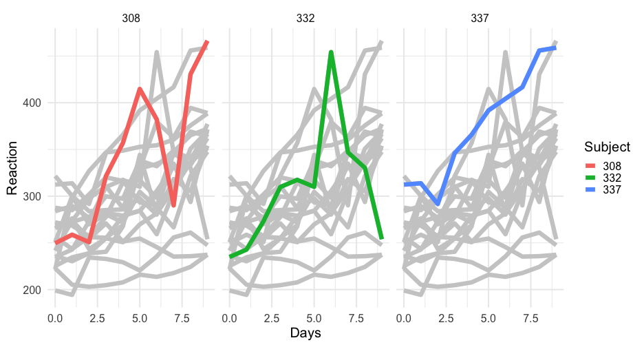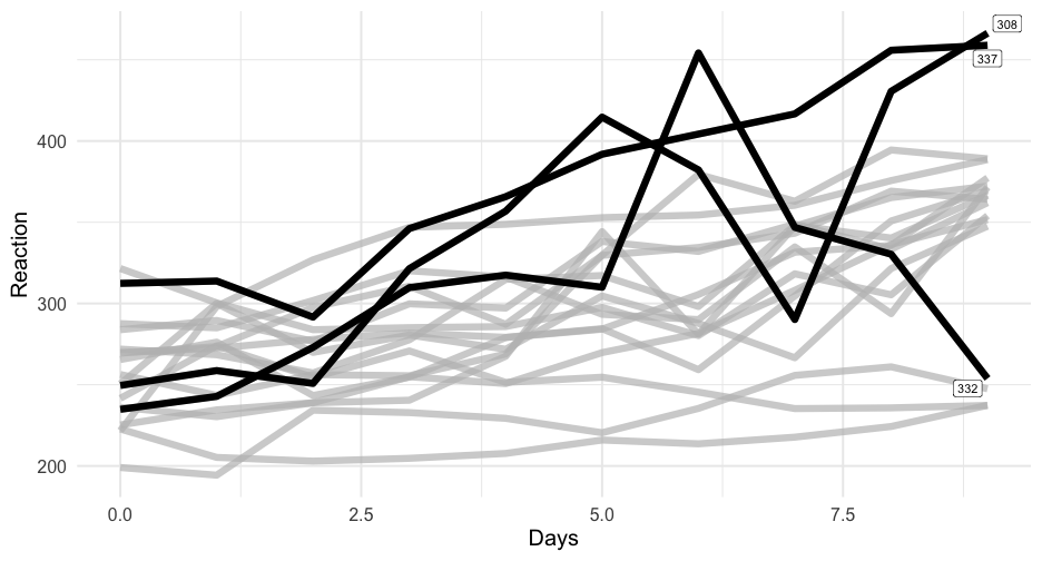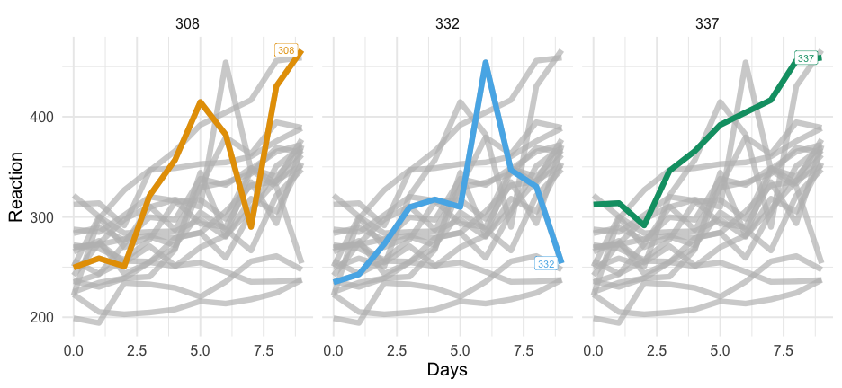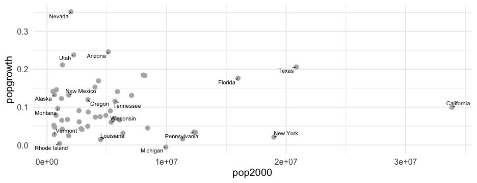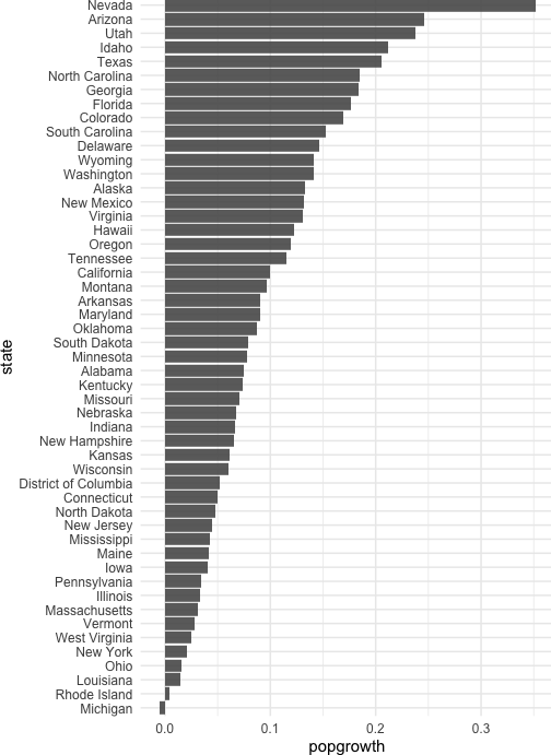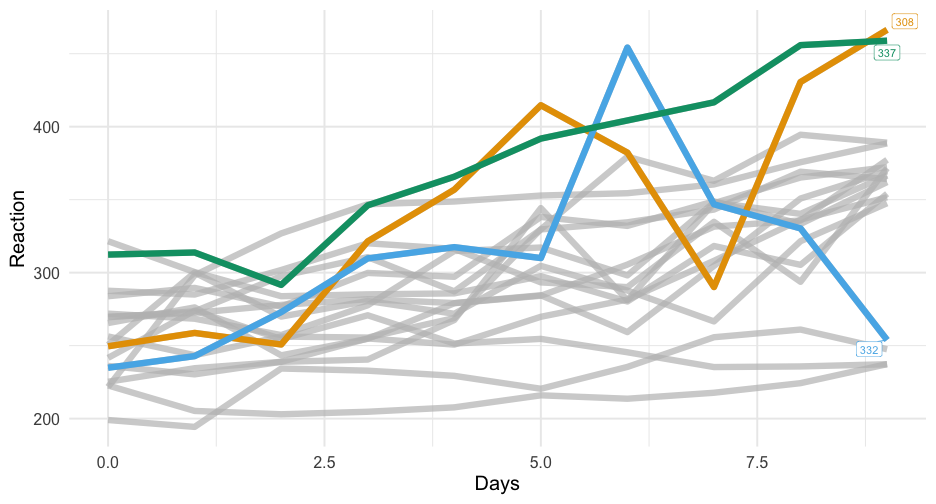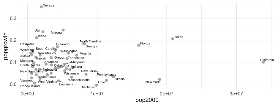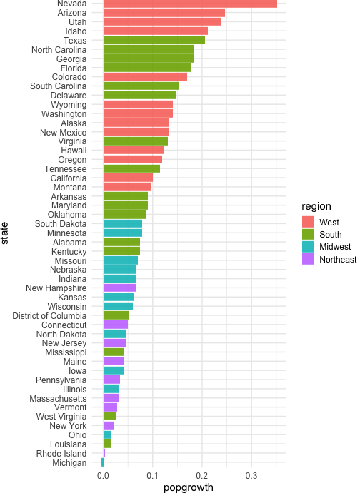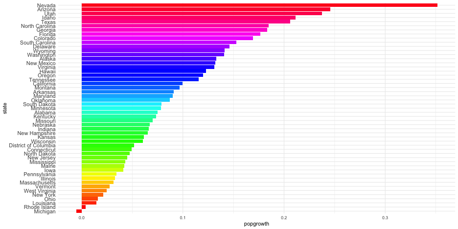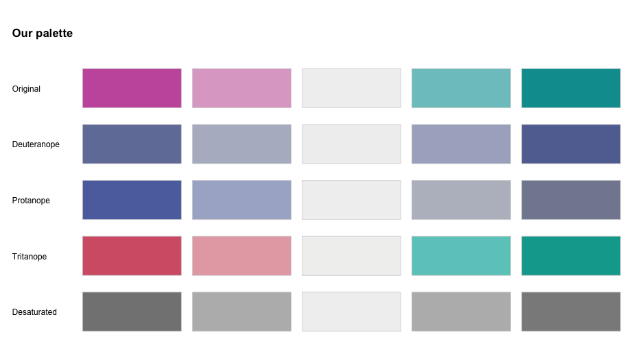 class: center, middle, inverse, title-slide # Colors! ### Daniel Anderson ### Week 5 --- layout: true <script> feather.replace() </script> <div class="slides-footer"> <span> <a class = "footer-icon-link" href = "https://github.com/uo-datasci-specialization/c2-dataviz-2022/raw/main/static/slides/w5.pdf"> <i class = "footer-icon" data-feather="download"></i> </a> <a class = "footer-icon-link" href = "https://dataviz-2022.netlify.app/slides/w5.html"> <i class = "footer-icon" data-feather="link"></i> </a> <a class = "footer-icon-link" href = "https://github.com/uo-datasci-specialization/c2-dataviz-2022"> <i class = "footer-icon" data-feather="github"></i> </a> </span> </div> --- class: inverse-blue # Data viz in Wild Havi Tingyu Dillon ### Eliott, Merly & Esmeralda on deck --- # Agenda * Review Lab 2 * Color basics + 3 basic ways color is used * Color blindness * Some common problems with color use * Quick discussion of palettes * Lab 3 --- class: inverse-red middle # Review Lab 2 --- # Learning Objectives * Understand different types of color palettes + ...and when you should use one versus another * Understand and be able to effectively evaluate concerns related to color blindness * Be able to fluently change colors/fills within ggplot --- # Before we get too deep ### Some very practical advice * Keep straight when color is mapped to a variable through `aes` and when it's modifying an element overall + Former requires `scale_color_*` or `scale_fill_*` while the latter does not -- * Keep straight colors and fills (see former bullet) -- * Use advice of others to your advantage (e.g., http://colorbrewer2.org/) --- class: inverse bottom center background-image:url(http://socviz.co/assets/ch-01-luminance-contrast-color.png) background-size:contain # Why color choice matters --- class: inverse bottom center background-image:url(http://socviz.co/assets/ch-01-luminance-contrast-bw.png) background-size:contain # Why color choice matters --- class: inverse-red middle # Another quick example .realbig[ .middle[ .center[ [{rayshader}](https://resources.rstudio.com/rstudio-conf-2019/3d-mapping-plotting-and-printing-with-rayshader) ] ] ] --- # 3 fundamental uses of color -- 1. Distinguish groups from each other -- 1. Represent data values -- 1. Highlight --- class:inverse-blue middle # Color as a tool to distinguish --- # Discrete items * Often no intrinsic order -- ### Qualitative color scale * Finite number of colors + Chosen to maximize distinctness, while also be equivalent + Equivalent - No color should stand out - No impression of order --- background-image:url(https://serialmentor.com/dataviz/color_basics_files/figure-html/qualitative-scales-1.png) background-size:contain # Some examples .footnote[See more about the Okabe Ito palette origins [here]( http://jfly.iam.u-tokyo.ac.jp/color/)] --- # How do we use them? Imagine we have data like this ```r popgrowth_df ``` ``` ## # A tibble: 51 × 7 ## region division state pop2000 pop2010 popgrowth ## <fct> <chr> <fct> <dbl> <dbl> <dbl> ## 1 Midwest East North Central Michigan 9938444 9883640 -0.005514344 ## 2 Northeast New England Rhode Island 1048319 1052567 0.004052202 ## 3 South West South Central Louisiana 4468976 4533372 0.01440956 ## 4 Midwest East North Central Ohio 11353140 11536504 0.01615095 ## 5 Northeast Middle Atlantic New York 18976457 19378102 0.02116544 ## 6 South South Atlantic West Virginia 1808344 1852994 0.02469110 ## # … with 45 more rows, and 1 more variable: area <dbl> ``` --- # Maybe a plot like this .pull-left[ ```r ggplot(popgrowth_df, aes(x = popgrowth, y = state)) + geom_col(alpha = 0.9) ``` ] .pull-right[ <!-- --> ] --- # Alternatively, fill by region .pull-left[ ```r ggplot(popgrowth_df, aes(x = popgrowth, y = state)) + geom_col(aes(fill = region), alpha = 0.9) ``` ] .pull-right[ <!-- --> ] --- # Problem with default palette <!-- --> --- # Alternative: viridis .pull-left[ ```r ggplot(popgrowth_df, aes(x = popgrowth, y = state)) + geom_col(aes(fill = region), alpha = 0.9) + * scale_fill_viridis_d() ``` ] .pull-right[ <!-- --> ] --- # Revised version <!-- --> --- # The Okabe Ito palette .pull-left[ * From [Color Universal Design](http://jfly.iam.u-tokyo.ac.jp/color/) ```r *library(colorblindr) ggplot(popgrowth_df, aes(x = popgrowth, y = state)) + geom_col(aes(fill = region), alpha = 0.9) + * scale_fill_OkabeIto() ``` ] .pull-right[ <!-- --> ] --- # Okabe Ito for colorblindness <!-- --> --- # How am I checking for colorblindness? * Also part of the **{colorblindr}** package ([here](https://github.com/clauswilke/colorblindr)) + depends on the dev versions of **{colorspace}** and **{cowplot}**, which are useful packages in their own right ```r devtools::install_github("wilkelab/cowplot") install.packages("colorspace", repos = "http://R-Forge.R-project.org") devtools::install_github("clauswilke/colorblindr") ``` --- # A note on installation Occasionally people have run into issues with the install on the previous slide. If that happens, try `install.packages("colorBlindness")` instead, and use the `cvdPlot` function. (It's just a modified version of `cvd_grid` from *colorblindr*) --- ```r p <- ggplot(popgrowth_df, aes(x = popgrowth, y = state)) + geom_col(aes(fill = region), alpha = 0.9) + scale_fill_OkabeIto() + * theme_void() # not necessary but I like it *colorblindr::cvd_grid(p) ``` <!-- --> --- class: inverse-orange middle # Colors for continuous values --- background-image:url(https://serialmentor.com/dataviz/color_basics_files/figure-html/sequential-scales-1.png) background-size:contain # Sequential scale examples --- # Sequential scales * Which values are larger/smaller -- * How distant two values are from each other -- + Scale must be perceptually uniform across its entire range -- + Similar to an interval scale, but for color -- * Often based on a single .bolder[hue] -- * Multi-hue sequential scales tend to follow gradients in the natural world --- class: inverse-red middle # Common uses of sequential palettes --- # H