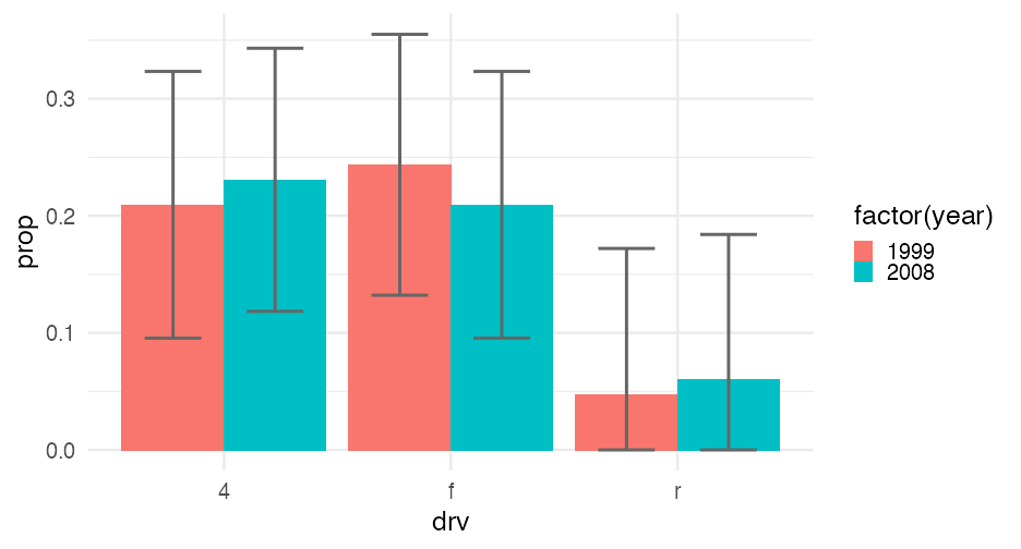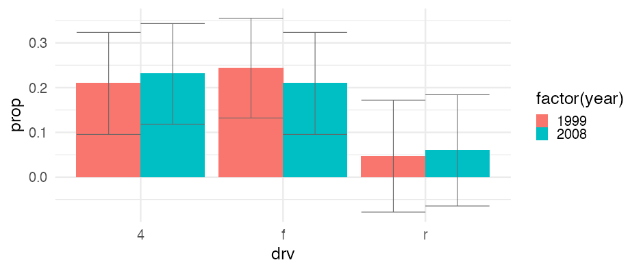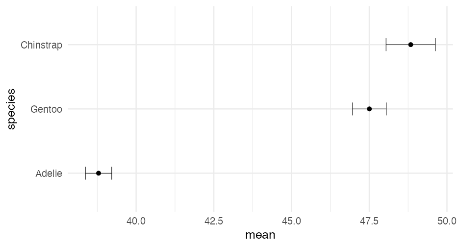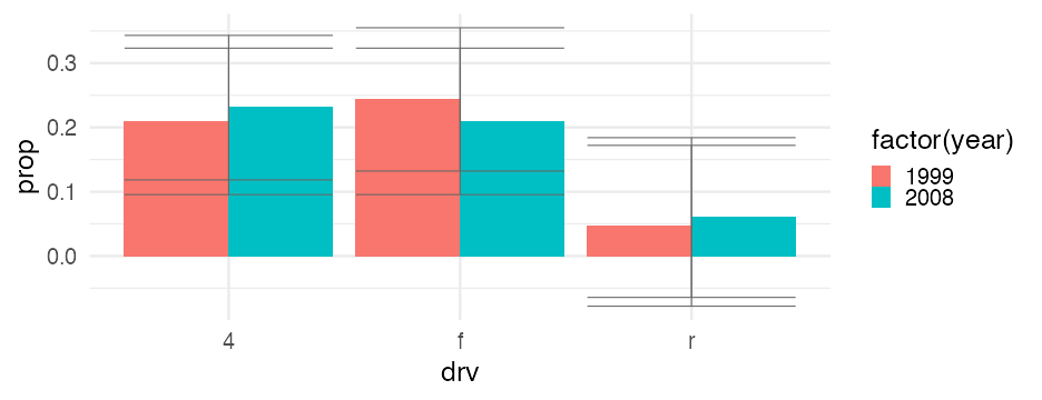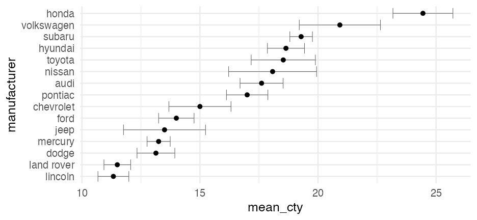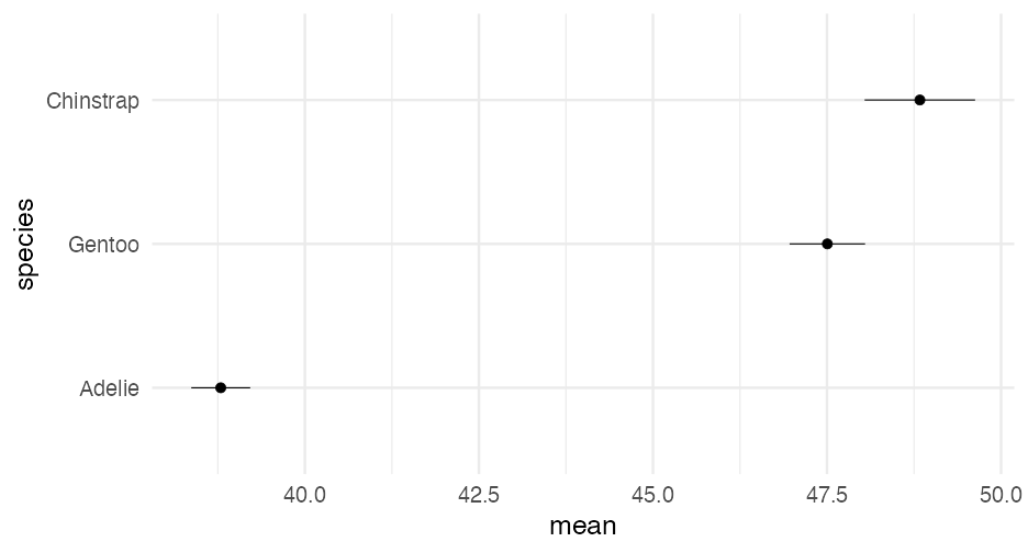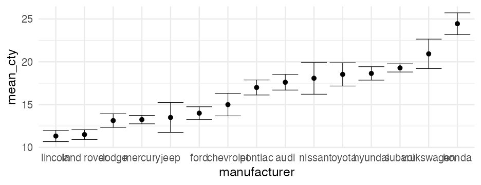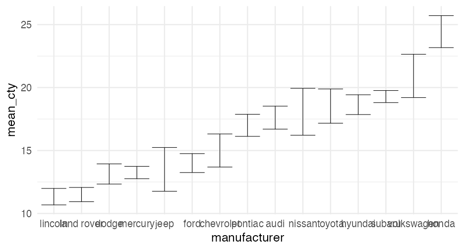 class: center, middle, inverse, title-slide # Visualizing uncertainty ### Daniel Anderson ### Week 7 --- layout: true <script> feather.replace() </script> <div class="slides-footer"> <span> <a class = "footer-icon-link" href = "https://github.com/uo-datasci-specialization/c2-dataviz-2022/raw/main/static/slides/w7.pdf"> <i class = "footer-icon" data-feather="download"></i> </a> <a class = "footer-icon-link" href = "https://dataviz-2022.netlify.app/slides/w7.html"> <i class = "footer-icon" data-feather="link"></i> </a> <a class = "footer-icon-link" href = "https://github.com/uo-datasci-specialization/c2-dataviz-2022"> <i class = "footer-icon" data-feather="github"></i> </a> </span> </div> --- class: inverse-blue # Data viz in the wild Cassie Amy Diana ### Errol and Mandi on deck --- # Agenda * Finish up plot refinement slides * Common ways of visualizing uncertainty + And how to implement them with {ggplot2} -- * Framing uncertainty as relative frequencies + Discrete probabilities + Non-discrete probabilities -- * Understanding standard errors + Non-standard ways of visualizing SEs -- * HOPs (pretty quick) + Also bootstrapping --- class: middle # Agenda (continued) Assuming we still have time (I think we will), we will also at least introduce **tables**. We probably will not have time for fonts, but I have slides for them as well in case we do. -- * Be comfortable with the basics of `gt` + create a table + format columns + create spanner heads + etc. -- * Understand how to use additional fonts (if you so choose) --- class: middle # Expectations for today Similar to last class, we will have times for you to practice, and times where I will ask you to follow along. Please make sure R is up and running. --- class: middle # A quick warning This will be a little more stats focused than basically any lecture we have through the first three courses of this sequence --- class: inverse-red middle # Finishing plot refinement --- class: inverse-blue middle # Uncertainty --- # Learning objectives 1. Understand there are lots of different ways to visualize uncertainty, and the best method may often be non-standard. 2. Understand how to implement basic methods, and the resources available to you to implement more advanced methods --- # The primary problem * When we see a point on a plot, we interpret it as **THE** value. <!-- --> --- # Let's have Dr. Kay explain <br/> <br/> <div style="text-align: center;"><iframe width="560" height="315" src="https://www.youtube.com/embed/E1kSnWvqCw0?start=52" frameborder="0" allow="accelerometer; autoplay; encrypted-media; gyroscope; picture-in-picture" allowfullscreen></iframe></div> --- # Some secondary problems * We're not great at understanding probabilities * We regularly round probabilities to 100% or 0% * As probabilities move to the tails, we're generally worse --- # How do we typically communicate uncertainty? -- Error bars <!-- --> --- # How? ### Vertical error bars `geom_errorbar` * Requires `ymin` and `ymax` aesthetics * You have to supply these - no calculation for you -- ### Horizontal error bars `geom_errorbarh` * Requires `xmin` and `xmax` --- # Example ```r mpg_by_man <- mpg %>% group_by(manufacturer) %>% summarize(mean_cty = mean(cty), se_cty = sd(cty) / sqrt(n())) head(mpg_by_man) ``` ``` ## # A tibble: 6 × 3 ## manufacturer mean_cty se_cty ## <chr> <dbl> <dbl> ## 1 audi 17.61111 0.4653967 ## 2 chevrolet 15 0.6710383 ## 3 dodge 13.13514 0.4085464 ## 4 ford 14 0.3829708 ## 5 honda 24.44444 0.6478835 ## 6 hyundai 18.64286 0.4006470 ``` --- ```r mpg_by_man %>% mutate(manufacturer = fct_reorder(manufacturer, mean_cty)) %>% ggplot(aes(manufacturer, mean_cty)) + geom_errorbar( aes(ymin = mean_cty + qnorm(0.025) * se_cty, ymax = mean_cty + qnorm(0.975) * se_cty) ) ``` <!-- --> --- # Put points on top ### Not under ```r mpg_by_man %>% mutate(manufacturer = fct_reorder(manufacturer, mean_cty)) %>% ggplot(aes(manufacturer, mean_cty)) + geom_errorbar( aes(ymin = mean_cty + qnorm(0.025) * se_cty, ymax = mean_cty + qnorm(0.975) * se_cty) ) + geom_point() ``` <!-- --> --- ```r mpg_by_man %>% mutate(manufacturer = fct_reorder(manufacturer, mean_cty)) %>% ggplot(aes(mean_cty, manufacturer)) + geom_errorbarh( aes(xmin = mean_cty - 1.96 * se_cty, xmax = mean_cty + 1.96 * se_cty), color = "gray40" ) + geom_point() ``` <!-- --> --- # Practice