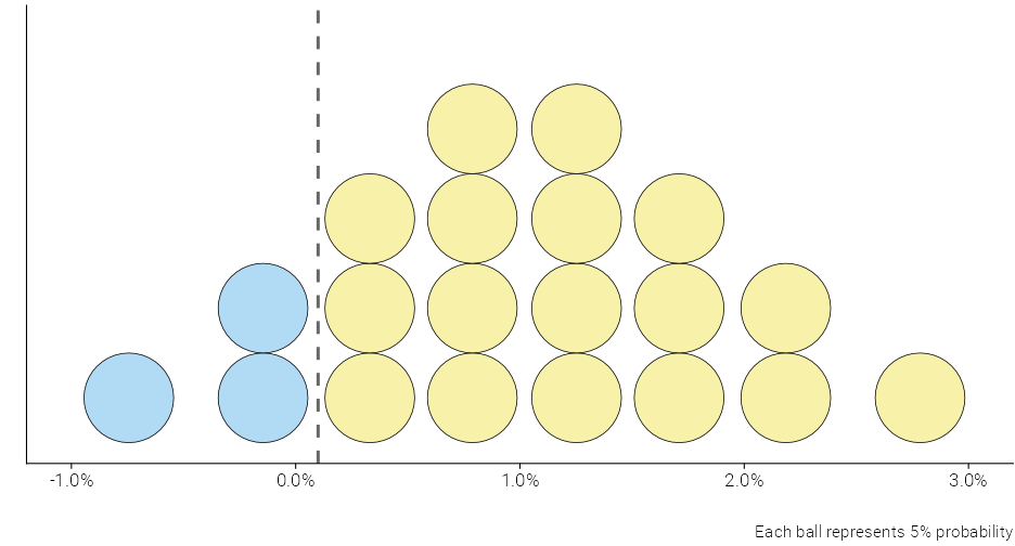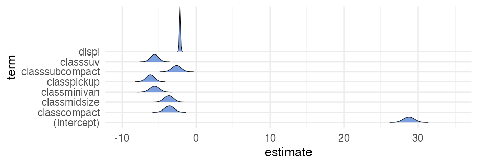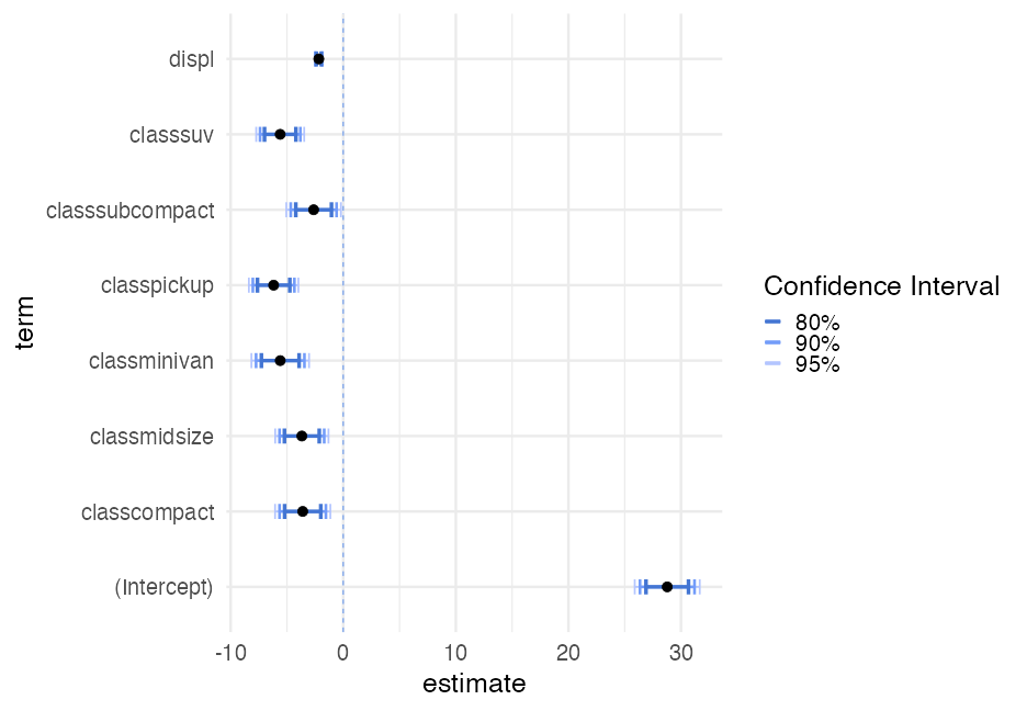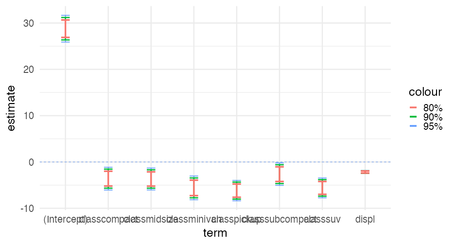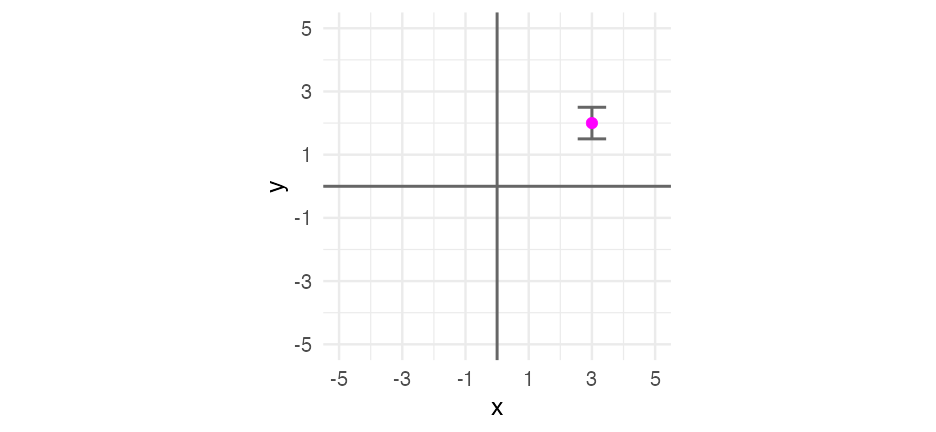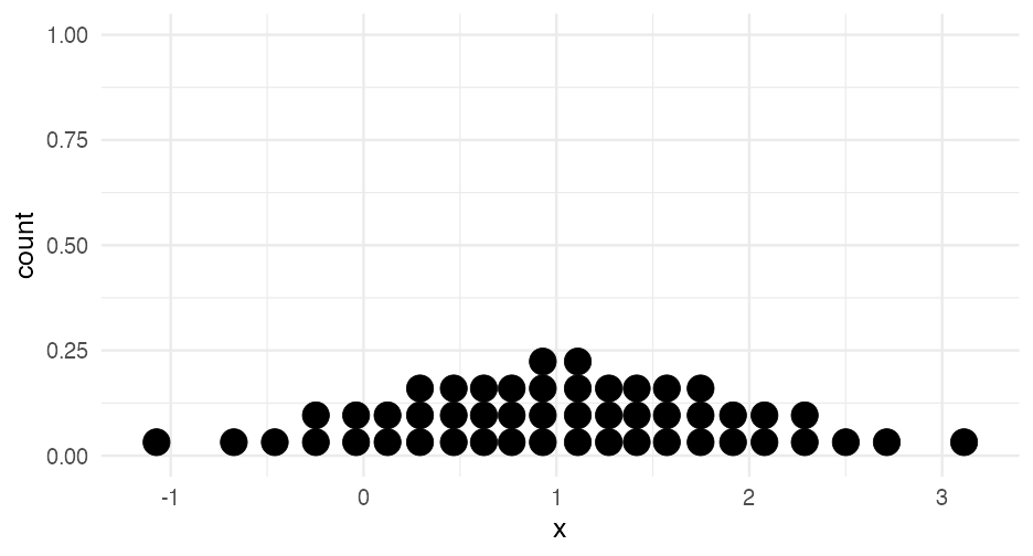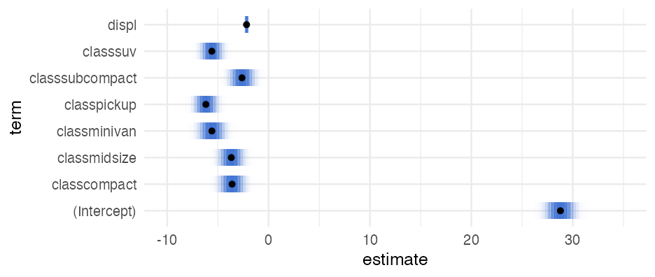 class: center, middle, inverse, title-slide # Visualizing uncertainty ### Daniel Anderson ### Week 7 --- layout: true <script> feather.replace() </script> <div class="slides-footer"> <span> <a class = "footer-icon-link" href = "https://github.com/uo-datasci-specialization/c2-dataviz-2022/raw/main/static/slides/w7.pdf"> <i class = "footer-icon" data-feather="download"></i> </a> <a class = "footer-icon-link" href = "https://dataviz-2022.netlify.app/slides/w7.html"> <i class = "footer-icon" data-feather="link"></i> </a> <a class = "footer-icon-link" href = "https://github.com/uo-datasci-specialization/c2-dataviz-2022"> <i class = "footer-icon" data-feather="github"></i> </a> </span> </div> --- class: inverse-blue # Data viz in the wild Cassie Amy Diana ### Errol and Mandi on deck --- # Agenda * Finish up plot refinement slides * Common ways of visualizing uncertainty + And how to implement them with {ggplot2} -- * Framing uncertainty as relative frequencies + Discrete probabilities + Non-discrete probabilities -- * Understanding standard errors + Non-standard ways of visualizing SEs -- * HOPs (pretty quick) + Also bootstrapping --- class: middle # Agenda (continued) Assuming we still have time (I think we will), we will also at least introduce **tables**. We probably will not have time for fonts, but I have slides for them as well in case we do. -- * Be comfortable with the basics of `gt` + create a table + format columns + create spanner heads + etc. -- * Understand how to use additional fonts (if you so choose) --- class: middle # Expectations for today Similar to last class, we will have times for you to practice, and times where I will ask you to follow along. Please make sure R is up and running. --- class: middle # A quick warning This will be a little more stats focused than basically any lecture we have through the first three courses of this sequence --- class: inverse-red middle # Finishing plot refinement --- class: inverse-blue middle # Uncertainty --- # Learning objectives 1. Understand there are lots of different ways to visualize uncertainty, and the best method may often be non-standard. 2. Understand how to implement basic methods, and the resources available to you to implement more advanced methods --- # The primary problem * When we see a point on a plot, we interpret it as **THE** value. <!-- --> --- # Let's have Dr. Kay explain <br/> <br/> <div style="text-align: center;"><iframe width="560" height="315" src="https://www.youtube.com/embed/E1kSnWvqCw0?start=52" frameborder="0" allow="accelerometer; autoplay; encrypted-media; gyroscope; picture-in-picture" allowfullscreen></iframe></div> --- # Some secondary problems * We're not great at understanding probabilities * We regularly round probabilities to 100% or 0% * As probabilities move to the tails, we're generally worse --- # How do we typically communicate uncertainty? -- Error bars <!-- --> --- # How? ### Vertical error bars `geom_errorbar` * Requires `ymin` and `ymax` aesthetics * You have to supply these - no calculation for you -- ### Horizontal error bars `geom_errorbarh` * Requires `xmin` and `xmax` --- # Example ```r mpg_by_man <- mpg %>% group_by(manufacturer) %>% summarize(mean_cty = mean(cty), se_cty = sd(cty) / sqrt(n())) head(mpg_by_man) ``` ``` ## # A tibble: 6 × 3 ## manufacturer mean_cty se_cty ## <chr> <dbl> <dbl> ## 1 audi 17.61111 0.4653967 ## 2 chevrolet 15 0.6710383 ## 3 dodge 13.13514 0.4085464 ## 4 ford 14 0.3829708 ## 5 honda 24.44444 0.6478835 ## 6 hyundai 18.64286 0.4006470 ``` --- ```r mpg_by_man %>% mutate(manufacturer = fct_reorder(manufacturer, mean_cty)) %>% ggplot(aes(manufacturer, mean_cty)) + geom_errorbar( aes(ymin = mean_cty + qnorm(0.025) * se_cty, ymax = mean_cty + qnorm(0.975) * se_cty) ) ``` <!-- --> --- # Put points on top ### Not under ```r mpg_by_man %>% mutate(manufacturer = fct_reorder(manufacturer, mean_cty)) %>% ggplot(aes(manufacturer, mean_cty)) + geom_errorbar( aes(ymin = mean_cty + qnorm(0.025) * se_cty, ymax = mean_cty + qnorm(0.975) * se_cty) ) + geom_point() ``` <!-- --> --- ```r mpg_by_man %>% mutate(manufacturer = fct_reorder(manufacturer, mean_cty)) %>% ggplot(aes(mean_cty, manufacturer)) + geom_errorbarh( aes(xmin = mean_cty - 1.96 * se_cty, xmax = mean_cty + 1.96 * se_cty), color = "gray40" ) + geom_point() ``` <!-- --> --- # Practice