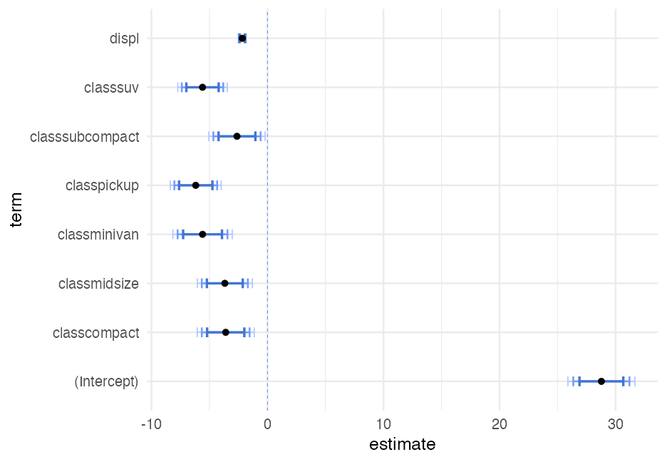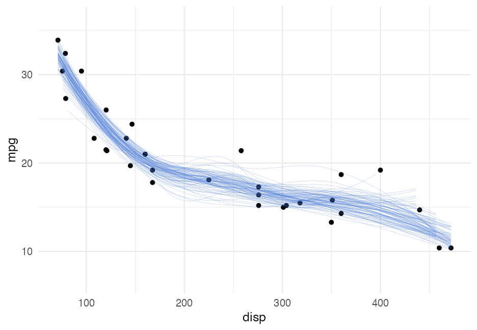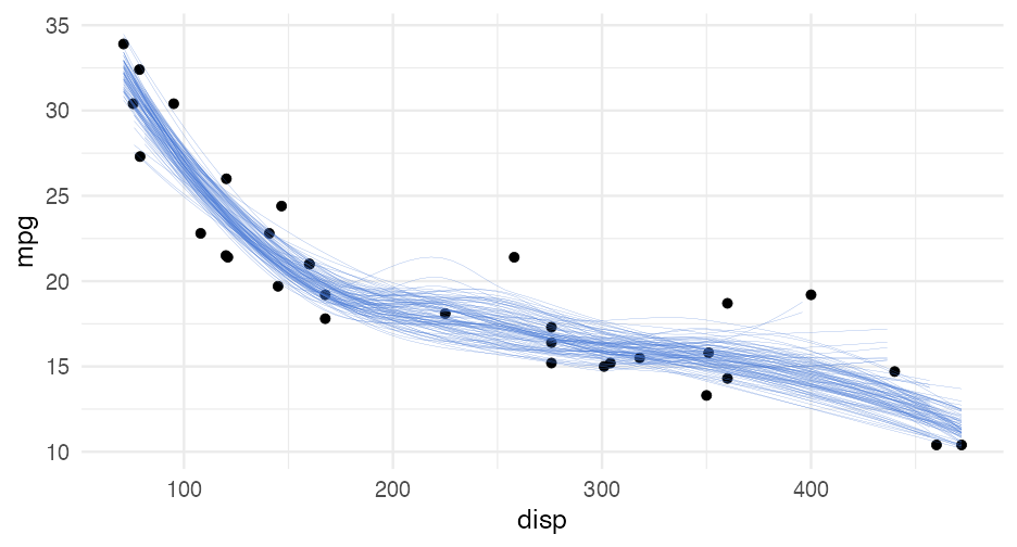 --- class: inverse-blue center middle # HOPs ### Hypothetical Outcome Plots (and related plots) --- # Standard regression plot ```r ggplot(mtcars, aes(disp, mpg)) + geom_point() + geom_smooth() ``` <!-- --> --- # Alternative <!-- --> --- # How? ### Bootstrapping ```r row_samps <- replicate( 100, sample( seq_len(nrow(mtcars)), nrow(mtcars), replace = TRUE ), simplify = FALSE ) row_samps ``` ``` ## [[1]] ## [1] 22 30 25 25 5 31 19 13 19 20 17 1 4 12 ## [15] 12 25 20 21 16 23 11 23 14 1 24 20 10 30 ## [29] 27 24 22 23 ## ## [[2]] ## [1] 25 1 18 18 25 8 8 16 25 19 31 13 11 10 ## [15] 21 6 14 14 12 24 27 29 22 5 6 8 14 16 ## [29] 7 13 17 13 ## ## [[3]] ## [1] 21 10 7 21 7 20 30 30 5 10 9 8 4 15 ## [15] 16 21 27 23 19 7 16 7 8 28 3 17 13 26 ## [29] 8 30 3 32 ## ## [[4]] ## [1] 20 10 2 6 19 21 11 6 16 9 17 4 25 4 ## [15] 27 29 19 21 1 16 6 13 29 8 2 14 11 3 ## [29] 27 3 28 31 ## ## [[5]] ## [1] 32 3 6 16 6 18 27 2 10 15 30 12 20 26 ## [15] 19 7 16 31 20 3 7 8 30 22 9 13 23 9 ## [29] 20 7 13 20 ## ## [[6]] ## [1] 30 1 30 23 6 16 8 32 22 10 28 27 5 2 ## [15] 24 5 10 30 3 6 27 20 2 12 26 7 13 23 ## [29] 25 22 18 8 ## ## [[7]] ## [1] 30 17 1 13 28 22 13 9 9 20 22 8 13 27 ## [15] 29 2 23 21 21 25 12 3 19 18 17 22 10 28 ## [29] 31 12 17 18 ## ## [[8]] ## [1] 20 22 23 2 15 15 4 32 17 15 25 24 3 5 ## [15] 15 3 16 31 17 22 24 9 23 29 24 13 25 20 ## [29] 23 20 27 4 ## ## [[9]] ## [1] 24 25 17 7 20 14 27 11 3 27 7 24 21 7 ## [15] 18 26 32 31 30 18 6 11 21 5 7 11 9 29 ## [29] 15 3 26 2 ## ## [[10]] ## [1] 1 2 18 28 1 2 5 1 16 3 10 8 14 3 ## [15] 13 2 30 24 28 15 16 27 18 4 22 14 19 26 ## [29] 32 19 2 28 ## ## [[11]] ## [1] 13 23 12 14 10 24 7 7 13 17 32 19 9 1 ## [15] 27 15 30 23 11 2 22 4 24 3 29 28 26 12 ## [29] 29 32 32 23 ## ## [[12]] ## [1] 10 16 2 13 14 6 1 7 1 3 17 31 21 15 ## [15] 31 20 8 17 19 16 22 28 31 28 14 23 14 26 ## [29] 8 22 19 8 ## ## [[13]] ## [1] 18 8 9 19 9 8 20 30 4 15 30 6 32 32 ## [15] 8 10 18 12 5 5 26 11 12 7 18 10 29 1 ## [29] 1 6 27 19 ## ## [[14]] ## [1] 10 30 29 5 4 28 32 31 13 25 25 32 7 15 ## [15] 16 16 28 11 16 2 23 17 16 6 9 12 10 19 ## [29] 17 26 1 7 ## ## [[15]] ## [1] 7 22 24 3 6 20 8 18 9 6 17 3 1 10 ## [15] 22 6 19 24 4 19 30 1 27 7 19 13 29 16 ## [29] 8 23 18 13 ## ## [[16]] ## [1] 4 29 1 32 2 2 8 24 13 12 30 19 17 1 ## [15] 4 23 13 24 14 9 8 9 31 10 12 15 26 11 ## [29] 22 22 25 28 ## ## [[17]] ## [1] 2 15 11 31 12 29 21 15 4 1 28 22 20 17 ## [15] 22 24 12 24 13 6 15 17 25 32 6 4 29 32 ## [29] 20 24 29 4 ## ## [[18]] ## [1] 18 16 16 9 22 18 10 3 9 23 5 4 18 30 ## [15] 16 1 29 28 24 6 8 1 19 2 7 7 24 23 ## [29] 17 17 27 10 ## ## [[19]] ## [1] 14 25 13 12 2 10 18 13 5 22 3 5 28 31 ## [15] 29 20 12 16 31 31 29 10 28 10 5 12 4 3 ## [29] 3 26 26 12 ## ## [[20]] ## [1] 4 25 1 9 23 22 11 15 10 28 29 30 4 15 ## [15] 7 25 21 27 24 13 8 1 28 22 30 13 24 32 ## [29] 23 31 25 16 ## ## [[21]] ## [1] 5 22 9 18 22 16 24 32 13 29 13 16 17 22 ## [15] 11 10 10 20 1 2 14 1 21 3 30 29 26 20 ## [29] 4 12 27 5 ## ## [[22]] ## [1] 11 20 29 1 4 19 15 16 29 10 8 23 17 19 ## [15] 5 1 19 28 13 21 30 19 21 6 32 16 7 10 ## [29] 15 29 29 1 ## ## [[23]] ## [1] 5 23 31 23 16 15 27 2 6 20 20 26 13 10 ## [15] 14 15 27 9 30 16 4 2 23 3 1 27 11 8 ## [29] 6 32 28 12 ## ## [[24]] ## [1] 6 21 4 19 30 14 20 13 25 18 4 32 5 8 ## [15] 16 21 27 1 10 9 6 31 21 3 1 26 18 29 ## [29] 26 27 2 16 ## ## [[25]] ## [1] 14 21 1 32 1 11 24 11 4 11 11 20 29 16 ## [15] 19 3 27 1 15 31 11 12 3 30 17 21 28 19 ## [29] 11 3 26 32 ## ## [[26]] ## [1] 9 9 21 32 2 28 30 9 11 26 7 4 24 1 ## [15] 4 14 26 17 7 26 31 3 2 6 26 10 6 15 ## [29] 16 5 6 13 ## ## [[27]] ## [1] 16 5 12 29 1 28 17 11 17 21 14 26 5 31 ## [15] 7 4 31 4 1 26 25 9 32 6 18 7 11 23 ## [29] 12 10 23 30 ## ## [[28]] ## [1] 19 29 6 5 13 12 3 26 13 2 31 12 32 32 ## [15] 6 17 2 23 23 2 28 2 2 30 14 22 24 14 ## [29] 23 14 4 29 ## ## [[29]] ## [1] 5 22 22 1 32 1 19 5 13 14 7 18 14 4 ## [15] 23 2 20 21 13 3 23 30 29 18 23 11 10 13 ## [29] 8 21 31 24 ## ## [[30]] ## [1] 18 16 3 11 23 15 1 9 32 2 21 13 5 10 ## [15] 4 4 1 27 13 8 21 23 13 15 11 25 12 27 ## [29] 2 31 21 8 ## ## [[31]] ## [1] 29 11 27 17 29 14 25 8 27 31 21 30 7 26 ## [15] 32 31 2 11 14 30 11 3 11 32 18 27 13 28 ## [29] 4 11 25 12 ## ## [[32]] ## [1] 7 3 11 16 7 22 13 5 4 24 32 26 31 17 ## [15] 5 21 12 31 14 32 16 21 23 17 5 5 22 12 ## [29] 27 32 14 1 ## ## [[33]] ## [1] 17 12 4 21 1 19 12 32 27 4 25 4 2 7 ## [15] 13 19 14 3 12 19 7 12 32 28 20 32 3 13 ## [29] 32 6 32 12 ## ## [[34]] ## [1] 10 8 27 4 5 10 18 16 14 7 22 19 17 9 ## [15] 11 26 8 7 26 32 24 8 10 16 31 19 11 1 ## [29] 21 11 2 10 ## ## [[35]] ## [1] 1 31 21 24 19 12 7 10 5 17 6 11 31 18 ## [15] 5 22 10 14 22 20 13 31 13 9 16 7 7 21 ## [29] 22 25 24 8 ## ## [[36]] ## [1] 20 31 22 21 10 9 1 26 25 32 12 22 2 14 ## [15] 7 4 31 12 32 27 14 14 9 20 19 27 4 17 ## [29] 13 12 4 20 ## ## [[37]] ## [1] 25 14 10 12 23 4 15 3 4 27 19 23 7 7 ## [15] 21 2 23 1 8 29 12 26 21 5 7 18 30 20 ## [29] 15 21 32 19 ## ## [[38]] ## [1] 24 19 32 8 3 3 3 26 21 25 31 23 32 24 ## [15] 18 30 16 6 11 1 13 18 21 17 27 22 24 1 ## [29] 18 17 8 11 ## ## [[39]] ## [1] 17 27 25 10 22 23 8 12 11 8 9 32 30 14 ## [15] 16 32 22 1 14 6 19 16 30 12 26 3 19 3 ## [29] 20 7 7 3 ## ## [[40]] ## [1] 7 25 25 12 14 10 15 30 23 13 25 7 23 8 ## [15] 12 6 17 1 14 2 26 19 19 3 32 10 3 23 ## [29] 2 14 1 6 ## ## [[41]] ## [1] 8 30 28 31 13 16 5 2 31 31 5 13 10 7 ## [15] 14 12 17 16 8 26 19 7 21 6 2 30 17 14 ## [29] 20 16 23 13 ## ## [[42]] ## [1] 30 32 15 28 28 28 26 28 25 26 25 21 20 28 ## [15] 5 16 32 3 14 18 20 3 26 9 10 6 13 2 ## [29] 1 28 5 32 ## ## [[43]] ## [1] 19 21 2 11 8 19 2 20 27 15 25 26 5 18 ## [15] 8 30 27 14 2 3 4 12 11 3 18 17 10 26 ## [29] 21 28 14 10 ## ## [[44]] ## [1] 8 28 13 27 7 21 4 25 25 12 27 2 15 1 ## [15] 3 16 13 17 7 17 9 3 28 18 28 29 23 20 ## [29] 28 8 26 30 ## ## [[45]] ## [1] 31 6 21 28 7 22 27 8 26 27 4 6 1 8 ## [15] 11 12 32 15 19 1 24 15 5 3 11 8 23 32 ## [29] 28 17 19 16 ## ## [[46]] ## [1] 31 20 29 22 20 1 1 28 32 6 25 25 25 19 ## [15] 8 12 3 11 2 21 22 32 30 10 27 2