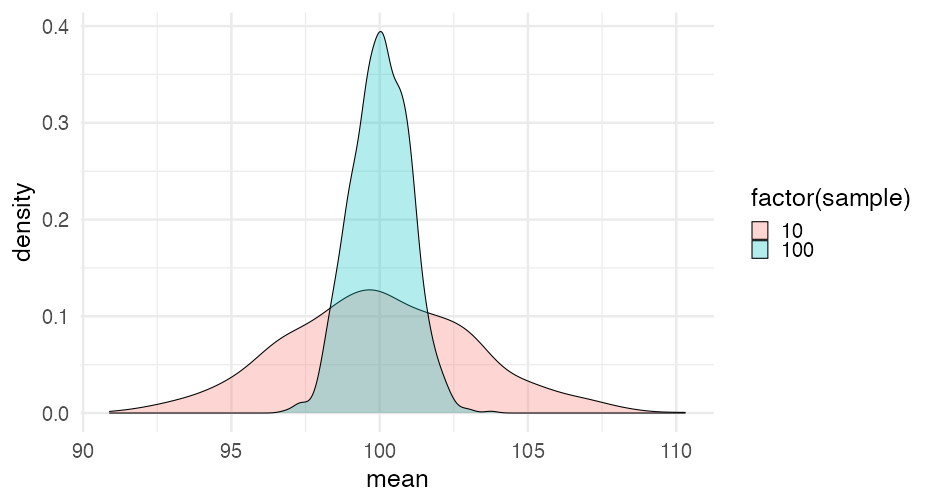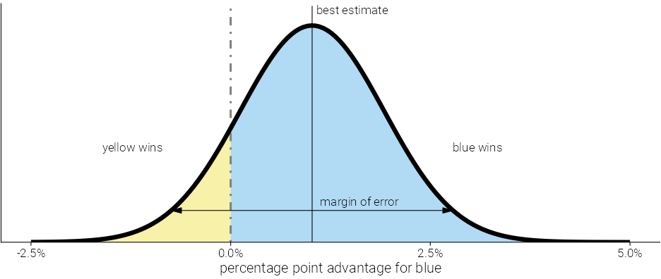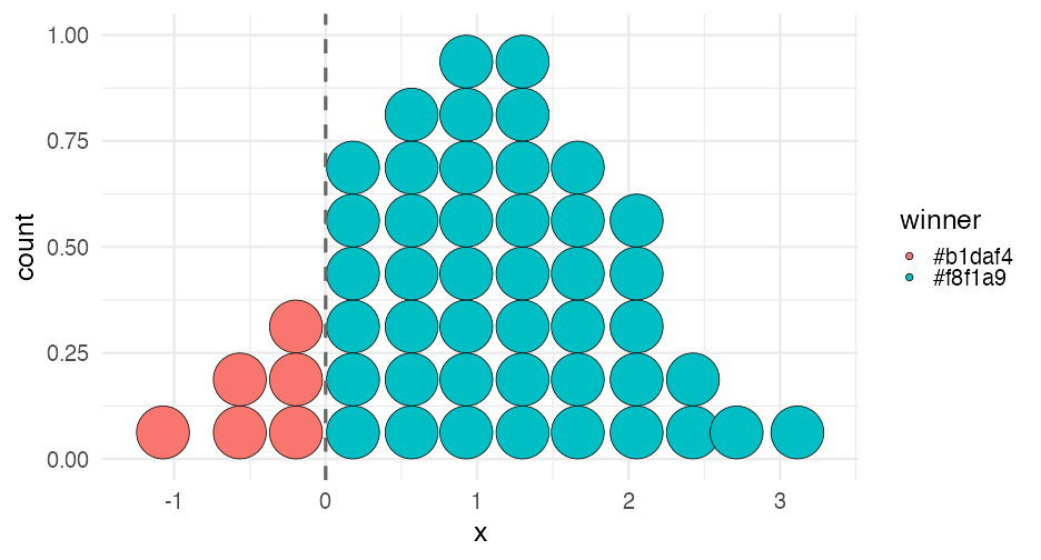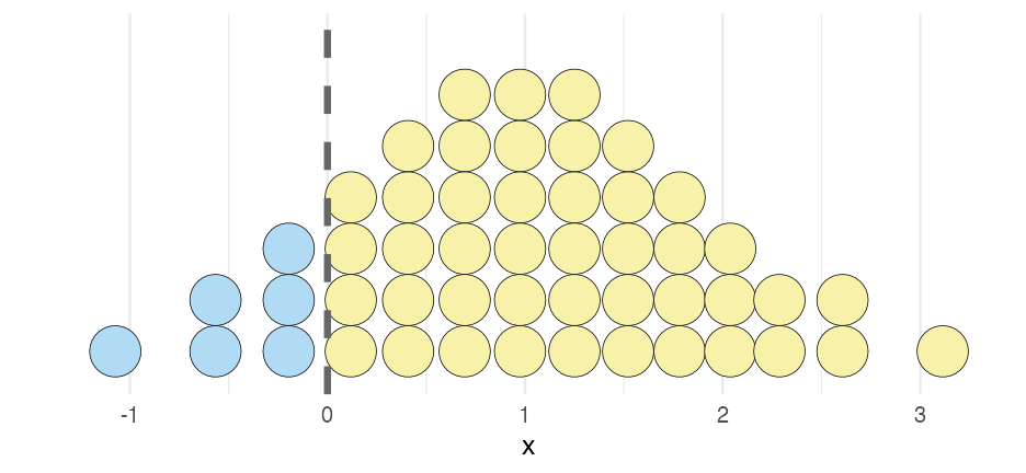 --- class: inverse-red center middle # Non-discrete probabilities --- # Hypothetical Blue party has 1% advantage w/ margin of error of 1.76 percentage points ### Who will win and **by how much**? -- <!-- --> --- # A bit of math Our distribution was defined by `\(\mu = 1.02\)` and `\(sd = 0.9\)`. -- * What's the chance the end result is **below zero**? (yellow wins) --- # The hard way Calculate the exact probability -- ### The distribution ```r x <- seq(-5, 5, 0.001) # some sample data likelihood <- dnorm(x, 1.02, 0.9) # probability of occuring sim <- data.frame(x, likelihood) ggplot(sim, aes(x, likelihood)) + geom_line(size = 1.2) ``` <!-- --> --- # How do we calculate this portion? <!-- --> --- # Integrate ```r zab <- filter(sim, x <= 0) pracma::trapz(zab$x, zab$likelihood) ``` ``` ## [1] 0.129 ``` --- # Easier: Simulate ```r random_draws <- rnorm(1e5, 1.02, 0.9) table(random_draws > 0) / 1e5 ``` ``` ## ## FALSE TRUE ## 0.128 0.872 ``` --- # Problem This approach works okay, but... * We're not great an interpreting probabilities * Not great at infering a probability from a density --- # Discretized plot ```r ppoints(50) ``` ``` ## [1] 0.01 0.03 0.05 0.07 0.09 0.11 0.13 0.15 ## [9] 0.17 0.19 0.21 0.23 0.25 0.27 0.29 0.31 ## [17] 0.33 0.35 0.37 0.39 0.41 0.43 0.45 0.47 ## [25] 0.49 0.51 0.53 0.55 0.57 0.59 0.61 0.63 ## [33] 0.65 0.67 0.69 0.71 0.73 0.75 0.77 0.79 ## [41] 0.81 0.83 0.85 0.87 0.89 0.91 0.93 0.95 ## [49] 0.97 0.99 ``` ```r qnorm(ppoints(50), 1.02, 0.9) ``` ``` ## [1] -1.07371 -0.67271 -0.46037 -0.30821 ## [5] -0.18668 -0.08388 0.00625 0.08721 ## [9] 0.16125 0.22989 0.29422 0.35504 ## [13] 0.41296 0.46847 0.52195 0.57373 ## [17] 0.62408 0.67321 0.72133 0.76861 ## [21] 0.81521 0.86126 0.90690 0.95226 ## [25] 0.99744 1.04256 1.08774 1.13310 ## [29] 1.17874 1.22479 1.27139 1.31867 ## [33] 1.36679 1.41592 1.46627 1.51805 ## [37] 1.57153 1.62704 1.68496 1.74578 ## [41] 1.81011 1.87875 1.95279 2.03375 ## [45] 2.12388 2.22668 2.34821 2.50037 ## [49] 2.71271 3.11371 ``` --- ```r discretized <- data.frame( x = qnorm(ppoints(50), 1.02, 0.9) ) %>% mutate(winner = ifelse(x <= 0, "#b1daf4", "#f8f1a9")) head(discretized) ``` ``` ## x winner ## 1 -1.0737 #b1daf4 ## 2 -0.6727 #b1daf4 ## 3 -0.4604 #b1daf4 ## 4 -0.3082 #b1daf4 ## 5 -0.1867 #b1daf4 ## 6 -0.0839 #b1daf4 ``` ```r tail(discretized) ``` ``` ## x winner ## 45 2.12 #f8f1a9 ## 46 2.23 #f8f1a9 ## 47 2.35 #f8f1a9 ## 48 2.50 #f8f1a9 ## 49 2.71 #f8f1a9 ## 50 3.11 #f8f1a9 ``` --- ```r ggplot(discretized, aes(x)) + geom_dotplot() ``` <!-- --> --- ```r ggplot(discretized, aes(x)) + geom_dotplot(aes(fill = winner)) ``` <!-- --> --- ```r ggplot(discretized, aes(x)) + geom_dotplot(aes(fill = winner), binwidth = 0.35) ``` <!-- --> --- ```r ggplot(discretized, aes(x)) + geom_dotplot(aes(fill = winner), binwidth = 0.35) + geom_vline(xintercept = 0, color = "gray40", linetype = "dashed", size = 1.5) ``` <!-- --> --- ```r ggplot(discretized, aes(x)) + geom_dotplot(aes(fill = winner), binwidth = 0.26) + geom_vline(xintercept = 0, color = "gray40", linetype = 2, size = 3) + scale_fill_identity(guide = "none") + scale_y_continuous(name = "", breaks = NULL) ``` <!-- --> --- # Probs too many though ```r discretized2 <- data.frame( x = qnorm(ppoints(20), 1.02, 0.9) ) %>% mutate(winner = ifelse(x <= 0, "#b1daf4", "#f8f1a9")) ggplot(discretized2, aes(x)) + geom_dotplot(aes(fill = winner), binwidth = 0.4) + geom_vline( xintercept = 0.1, color = "gray40", linetype = 2, size = 1.4) + scale_fill_identity(guide = "none") + scale_x_continuous( name = "", limits = c(-1, 3), labels = scales::percent_format(scale = 1) ) + theme_dviz_open(20, font_family = "Roboto Light") + scale_y_continuous(breaks = NULL, name = "") + labs(caption = "Each ball represents 5% probability") ``` --- <!-- --> --- class: inverse-red center middle # Uncertainty of point estimates --- # Quick (hopefully) review * What is a standard error? -- * Standard deviation of the sampling distribution * What is the sampling distribution? -- * Samples from the underlying, population-based, generative distribution * What does this mean, exactly? -- * Let's simulate to explore --- # Simulation * Imagine the "real" distribution has `\(\mu = 100\)` and `\(\sigma = 10\)`. -- * Let's draw a sample of 10 from this distribution -- ```r set.seed(123) samp10a <- rnorm(n = 10, mean = 100, sd = 10) samp10a ``` ``` ## [1] 94.4 97.7 115.6 100.7 101.3 117.2 104.6 ## [8] 87.3 93.1 95.5 ``` -- * Calculate the mean ```r mean(samp10a) ``` ``` ## [1] 101 ``` --- # Do it a second time -- ```r samp10b <- rnorm(n = 10, mean = 100, sd = 10) samp10b ``` ``` ## [1] 112.2 103.6 104.0 101.1 94.4 117.9 105.0 ## [8] 80.3 107.0 95.3 ``` ```r mean(samp10b) ``` ``` ## [1] 102 ``` --- # Do it a bunch of times ```r samples <- replicate(1000, rnorm(10, mean = 100, sd = 10), simplify = FALSE) samples ``` ``` ## [[1]] ## [1] 89.3 97.8 89.7 92.7 93.7 83.1 108.4 ## [8] 101.5 88.6 112.5 ## ## [[2]] ## [1] 104.3 97.0 109.0 108.8 108.2 106.9 105.5 ## [8] 99.4 96.9 96.2 ## ## [[3]] ## [1] 93.1 97.9 87.3 121.7 112.1 88.8 96.0 ## [8] 95.3 107.8 99.2 ## ## [[4]] ## [1] 102.5 99.7 99.6 113.7 97.7 115.2 84.5 ## [8] 105.8 101.2 102.2 ## ## [[5]] ## [1] 103.8 95.0 96.7 89.8 89.3 103.0 104.5 ## [8] 100.5 109.2 120.5 ## ## [[6]] ## [1] 95.1 76.9 110.1 92.9 93.1 110.3 97.2 ## [8] 87.8 101.8 98.6 ## ## [[7]] ## [1] 100.1 103.9 96.3 106.4 97.8 103.3 111.0 ## [8] 104.4 96.7 111.5 ## ## [[8]] ## [1] 109.9 105.5 102.4 93.7 113.6 94.0 121.9 ## [8] 115.3 97.6 89.7 ## ## [[9]] ## [1] 92.9 102.6 97.5 96.5 90.5 99.5 92.2 ## [8] 83.3 96.2 109.2 ## ## [[10]] ## [1] 94.2 106.1 83.8 99.4 105.2 103.0 101.1 ## [8] 93.6 91.5 89.8 ## ## [[11]] ## [1] 101.2 90.5 95.1 97.4 118.4 93.5 102.4 ## [8] 100.8 90.4 99.3 ## ## [[12]] ## [1] 114.4 104.5 100.4 95.8 79.5 111.3 85.4 ## [8] 107.4 119.1 85.6 ## ## [[13]] ## [1] 107.0 97.4 84.3 84.9 84.0 94.7 85.4 ## [8] 106.9 121.0 87.1 ## ## [[14]] ## [1] 107.9 107.7 103.3 89.9 98.8 97.2 105.6 ## [8] 96.3 109.8 96.3 ## ## [[15]] ## [1] 1
